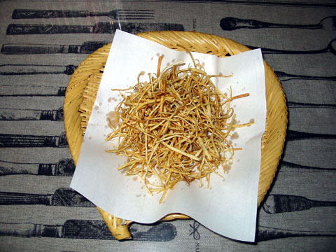 ごぼう(牛蒡)をささがきして、あく抜きの為に水にサッとさらして 良く水を切ってから素揚げしただけのものです。 ポテトチップスと同じく塩を振って食べます。私はコショウも少々加え ましたが。簡単なものですが、ビールのおつまみに好適と思います。 ごぼうは食物繊維を多く含んでいると言いますから、この点も良いと ころでしょう。尚、何度の油で揚げたのか女房に聞いたのですが、 「忘れた。適当」との答え。申し訳ありません。