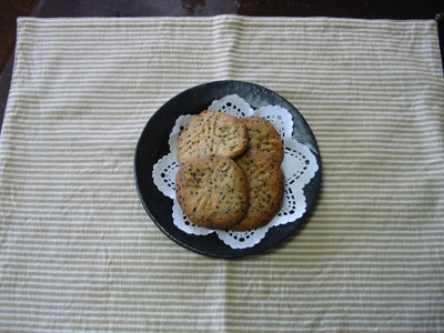 バター半分,ごまペースト半分で焼いたクッキーです。 写真ではせんべいの様に見えますが、実物もそんな感じです。 女房は自分で「あっぱれ! 天才ママ」だと言っていますが、それほど のものかどうか。 どうしてもHPに載せろと言うので載せて見ました。
