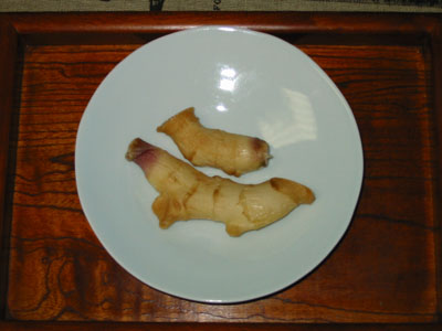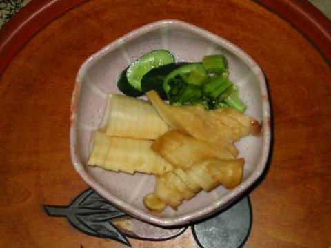 左の写真上がきゅうり、これは分かると 思いますが。左が大根、と区別が付き難 いのですが、右が生姜の味噌漬です。 こいつはただ、新生姜をそのまま味噌漬 にしたものですが、ピリッと辛くてなか なかいけます。 生姜は新生姜でないと硬くて上手く漬か らないと思います。多分。試した訳では ありませんが。 新生姜の写真はここをクリックして下さい